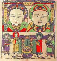 隋杜臺卿《玉燭寶典》引《灶書》稱,“灶神,姓蘇,名吉利,婦名搏頰”。唐李賢注引《雜五行書》又稱,“灶神名禪,字子郭,衣黃衣,披發(fā),從灶中出”。灶神初為女神,或稱是老婦,或稱是美女,說法諸多。大約出于清代的《敬灶全書》則稱,灶君姓張,名單,字子郭,當(dāng)屬男神?,F(xiàn)在民間供奉的東廚司命定福灶君,是一對老夫婦并坐,或是一男兩女并坐,即灶君和灶君夫人的畫像。