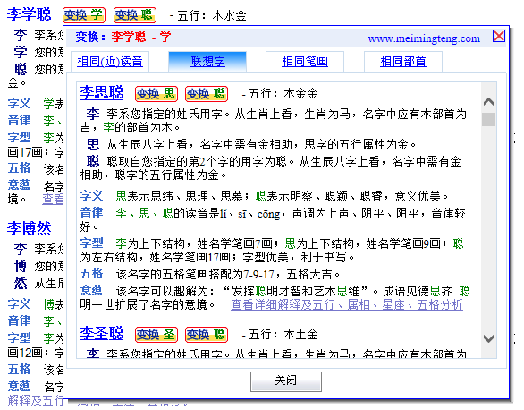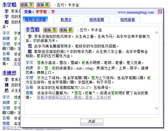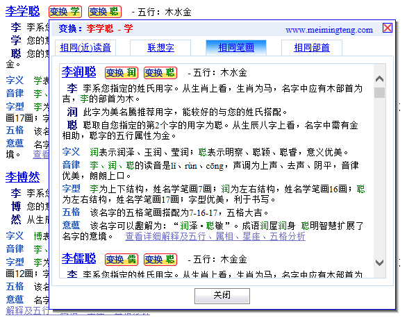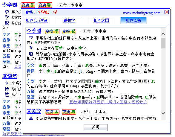 假設(shè)上面這個名字用戶覺得還不錯,但還不是那種十分滿足的類型。您可以點(diǎn)擊名字旁邊的變換按鈕。我們這里假設(shè)對“學(xué)”進(jìn)行變換,通過“同音、同(近)義,相同筆畫(姓名筆畫),相同部首”4個方面進(jìn)行變換可以得到如下名字: